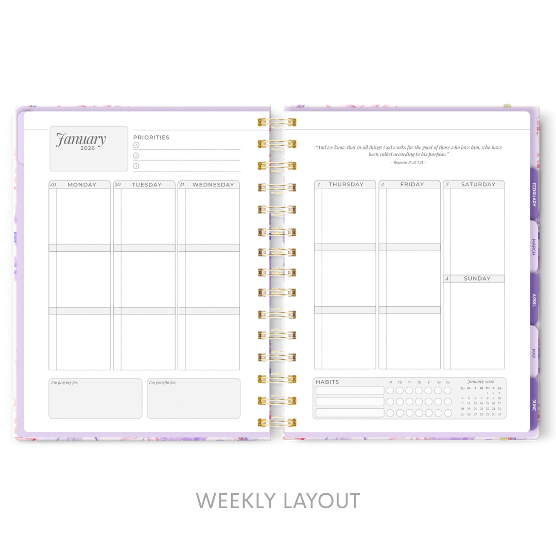 - Monthly and weekly layouts help you to plan your life with inspiration and focus on God.